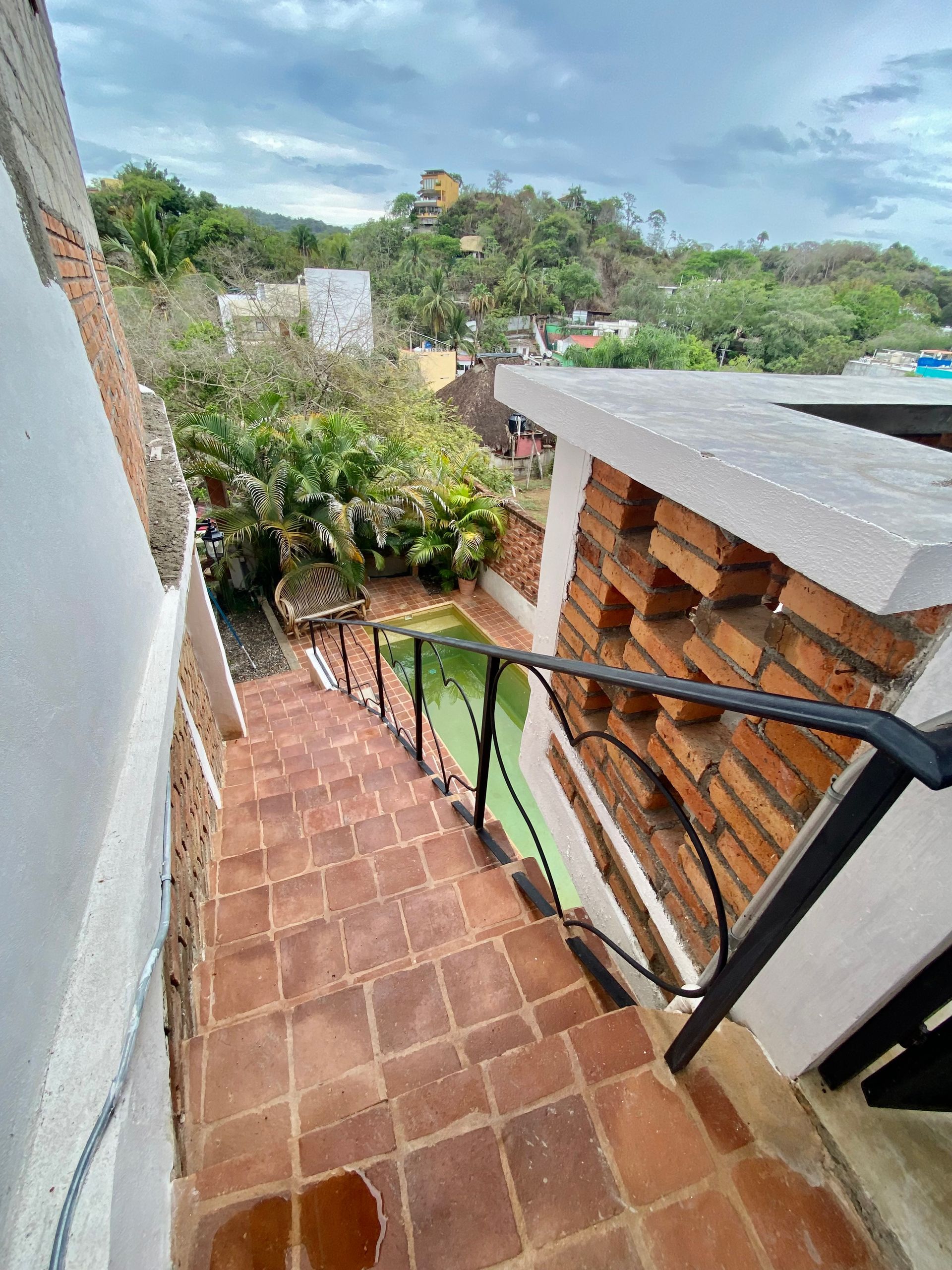 the stairwell up to the first pool area. There is a pool bathroom, Hammocks, fans and
